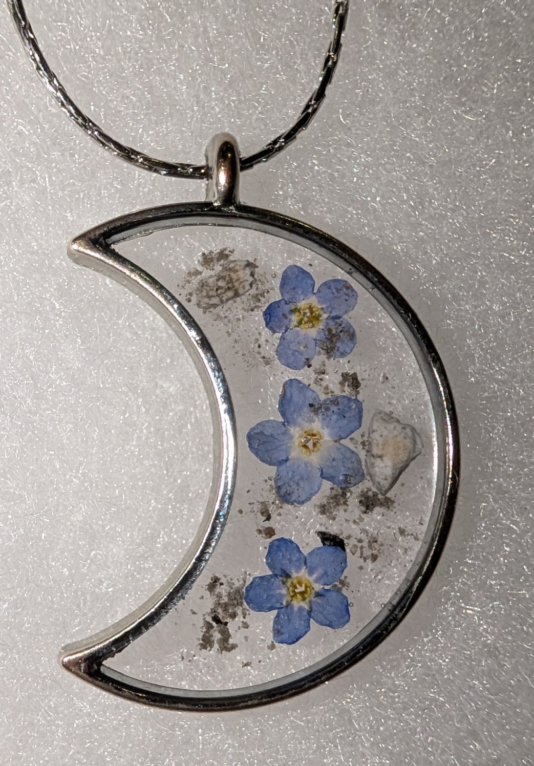 My Miss-Me-Not line of jewelry is 100% custom cremain jewelry for those of us who have lost our loved ones. This moon necklace is my personal necklace with my Dad's ashes along with Forget-Me-Not flowers. Miss-Me-Not's can be made with any flowers and/or ashes of any 2 or 4 legged loved one no longer with us.
